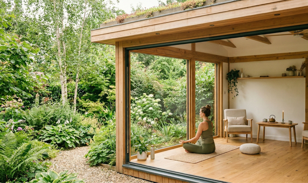 A dedicated outdoor studio means your wellness space isn’t competing with the rest of the house for space or attention. Large windows bring in natural light and garden views, both of which support a calmer, more focused session. And because space has one purpose, it becomes much easier to treat it that way.